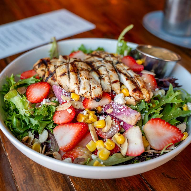 Grilled chicken, mixed greens, watermelon radish, almonds, strawberry, feta, sweet corn, and champagne vinaigrette.