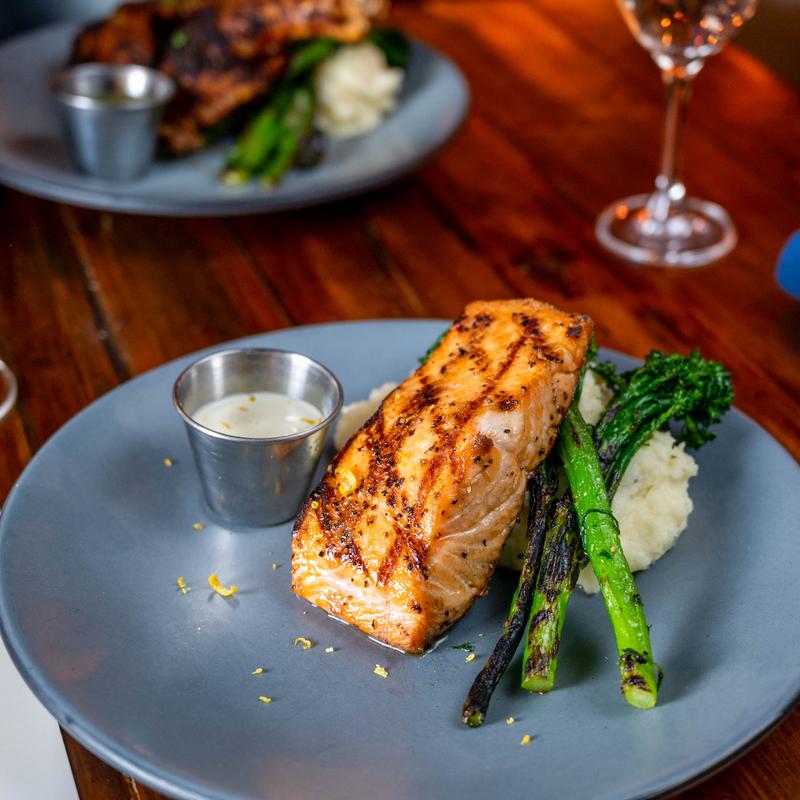 Scottish salmon, seasonal veggie, garlic herb mashed potatoes.