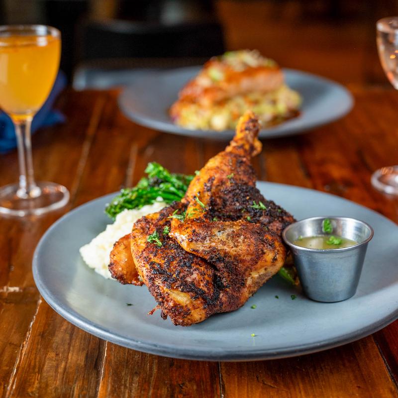 Mashed potatoes, seasonal veggie, and chicken jus.